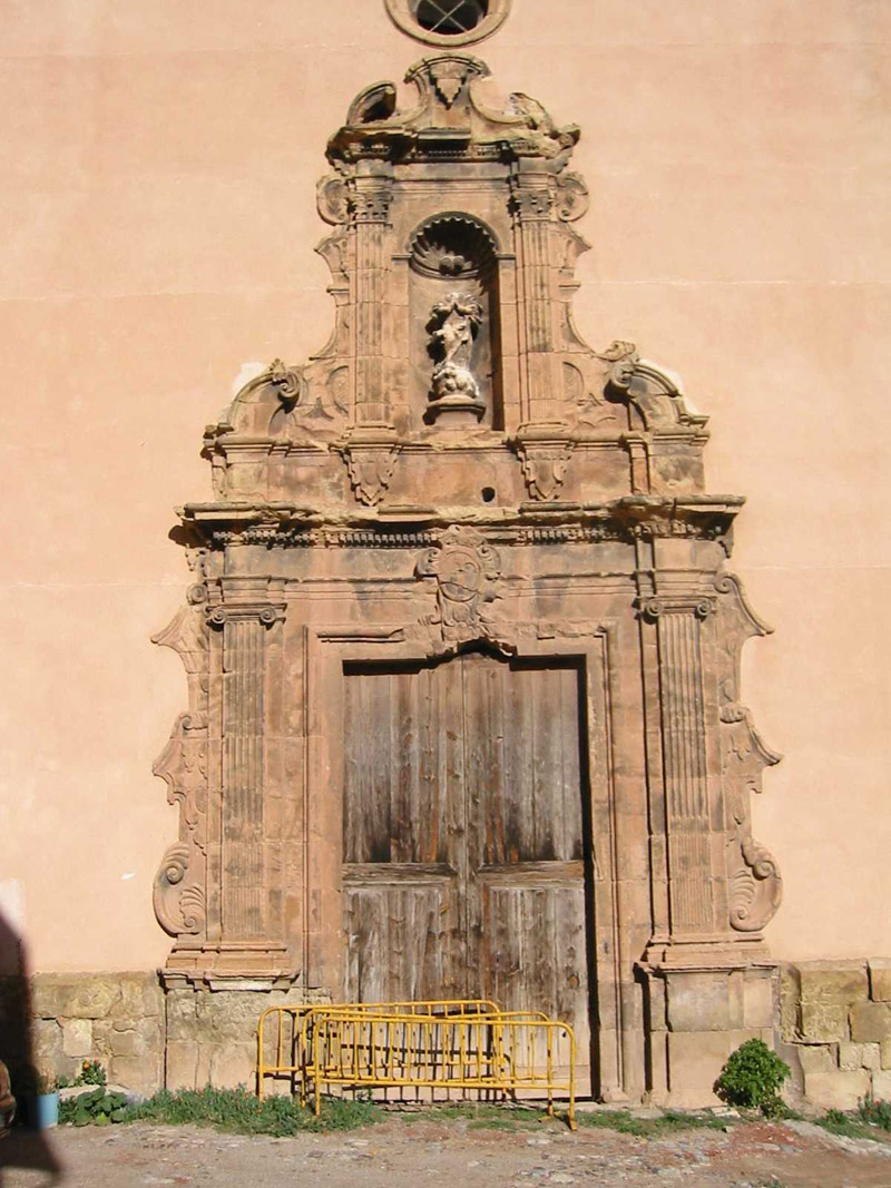 Al exterior el edificio queda determinado por la sobriedad de los paramentos netos y limpios y por el gran volumen del cuerpo de naves, cuya potencia y horizontalidad sólo está alterada por el contrapunto vertical de la torre y el cimborrio. Es en la fachada principal, a los pies, donde se concentra el tratamiento decorativo; se trata de un hastial de perfil mixtilíneo con una portada barroca de dos cuerpos, de los cuales el superior conserva una hornacina con una imagen de la Inmaculada bastante deteriorada.